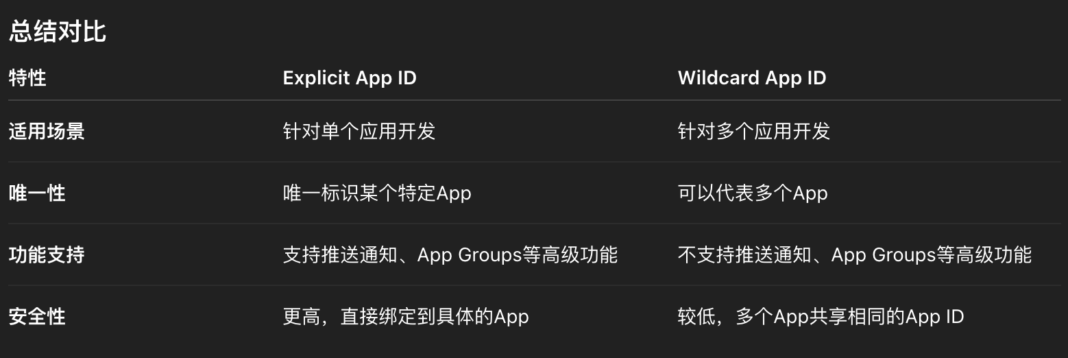 安全性较高,因为它与特定App相关联,不会与其他App产生冲突。 - Wildcard App ID (通配符App ID)