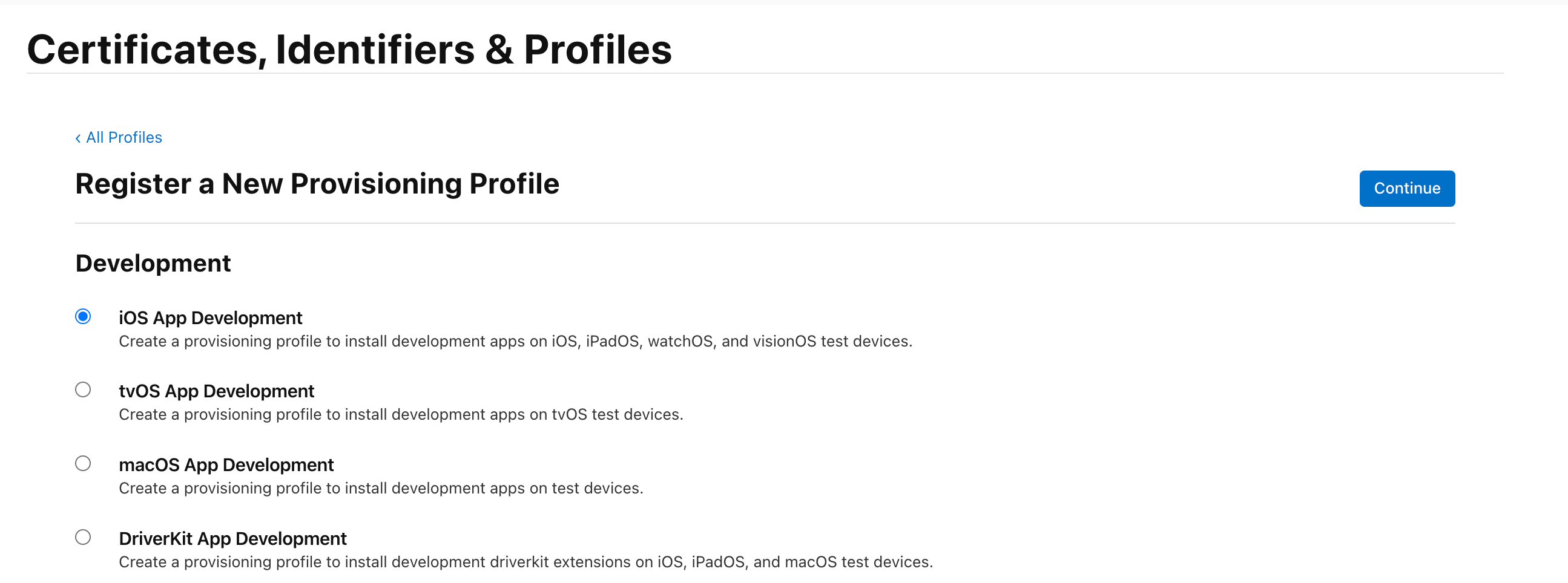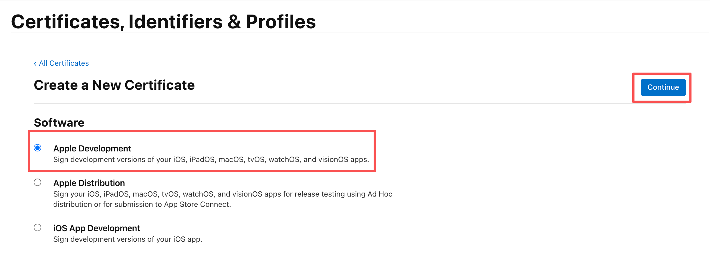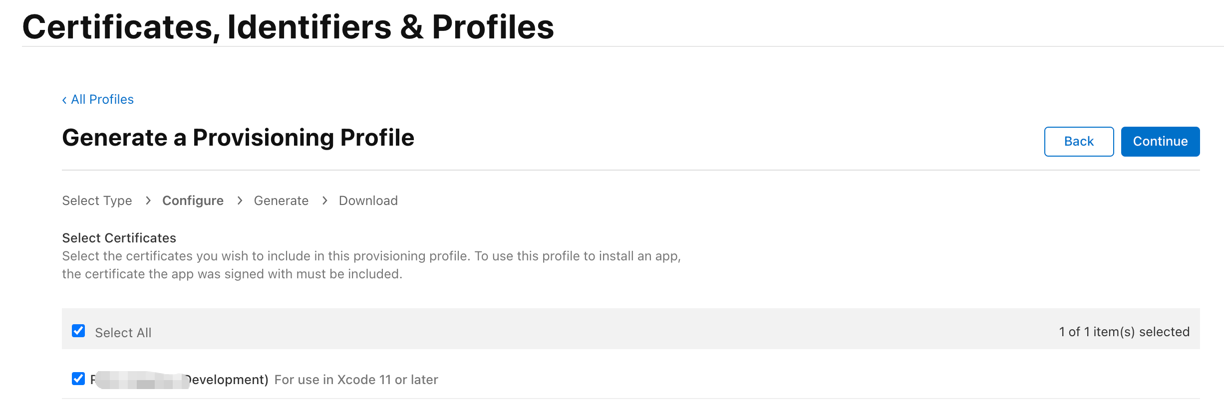 选择之前创建的Development开发证书