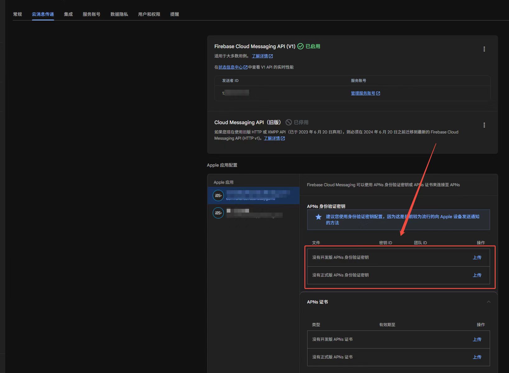 2、然后去下图所示位置,上传相应APNs密钥(官方推荐)