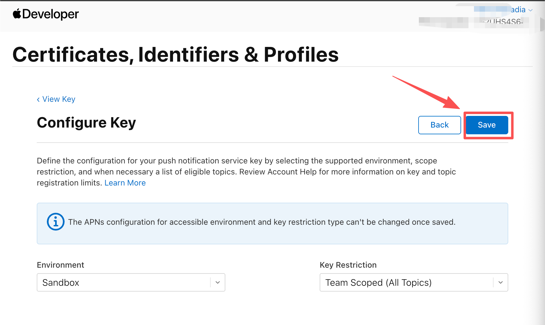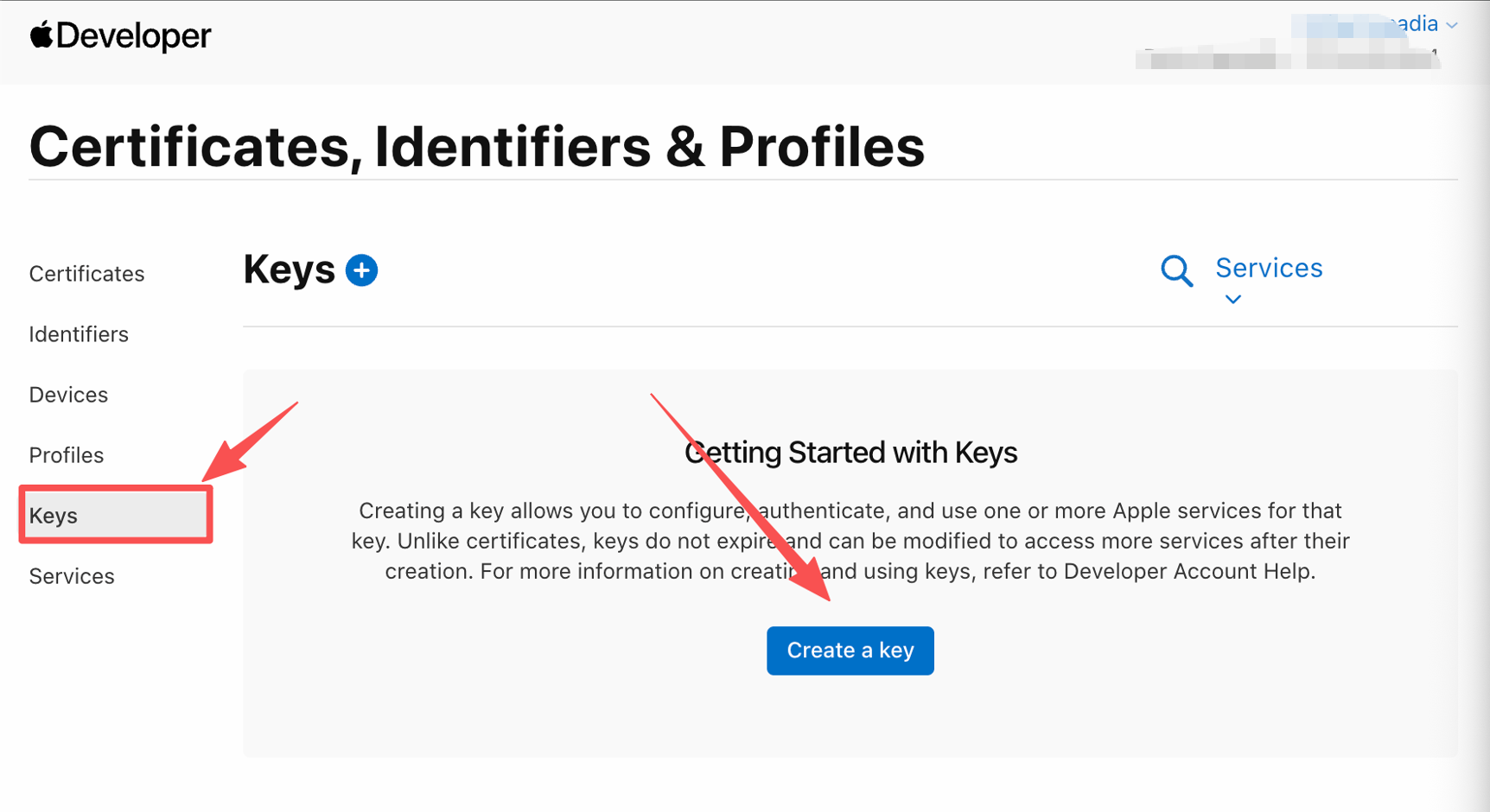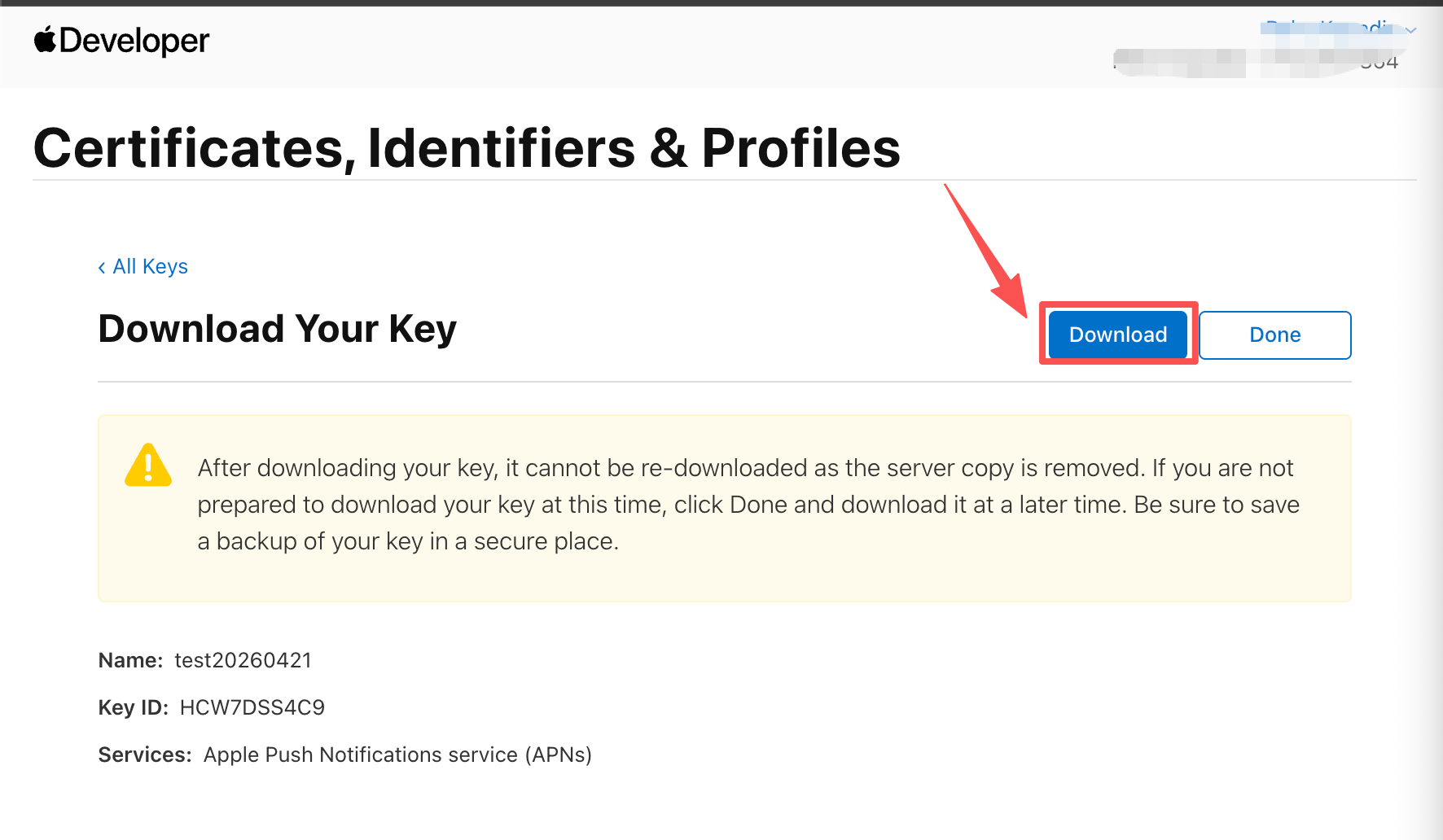 进入Apple Developer后台创建APNs Key