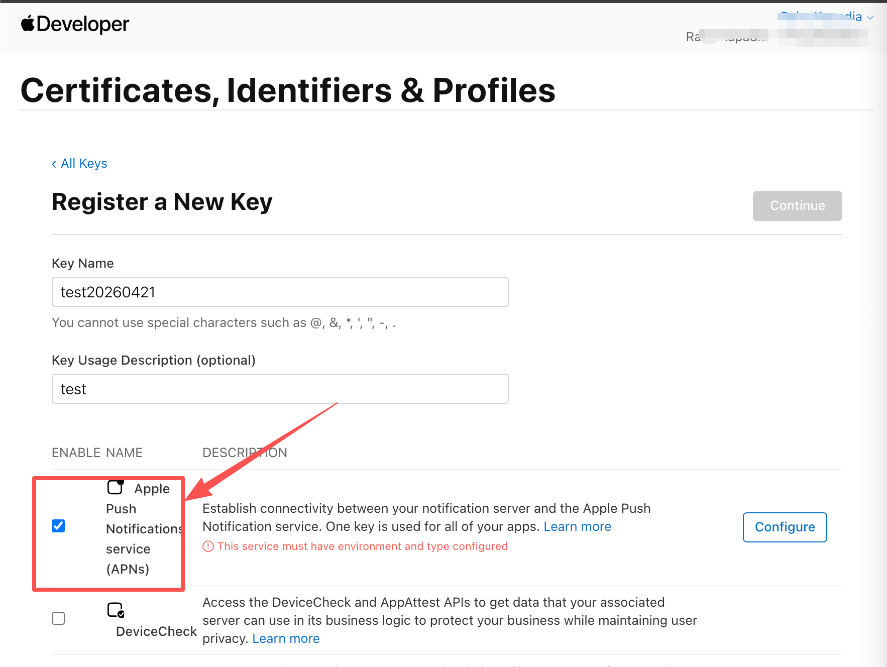 这里两个随便填,因为我们是接推送,所以这里勾选Apple Push Notifications service(APNs)